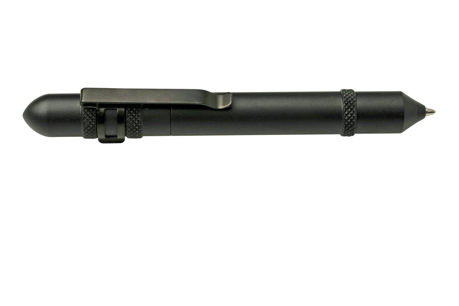 Ce Böker Plus Bit Pen est un petit stylo tactique bien pratique. Il a été conçu par Kevin Passon et David Cyr. Ils sont tous deux célèbres depuis des années dans le monde du stylo, grâce à leurs designs pratiques. Le Böker Bit Pen n’y fait pas exception. Ce stylo est en aluminium noir très léger. Pour ouvrir et fermer le stylo, Benchmade l’a doté d’un mécanisme Bolt-action. Cela permet au stylo d’être très solide et on a du mal à ne pas jouer avec. Grâce au clip de poche, on l’emporte partout sur soi. À l’extrémité du stylo, se cache un porte-embouts. Il est équipé d’un embout Torx 6-8. C’est bien pratique quand on doit revisser quelque chose en chemin. Ce stylo est compatible avec les cartouches Lamy M-22.
