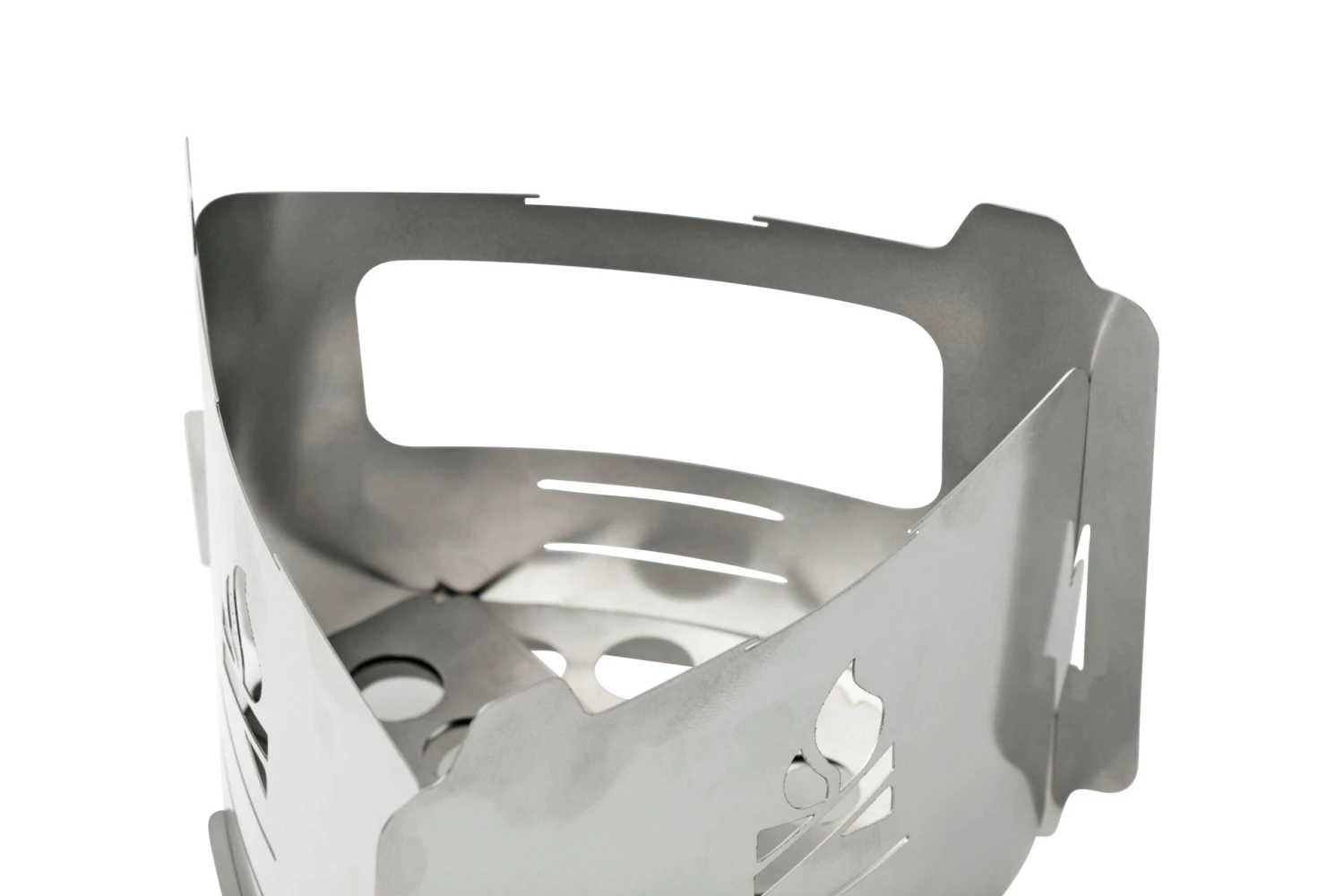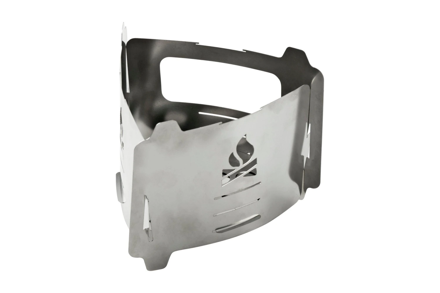 Le Bushcraft Essentials Bushbox Ultralight est un réchaud très léger, qui ne pèse qu’environ 70 grammes. Il suffit d’une minute pour le monter et vous pouvez ensuite allumer le feu. Pour cuisiner, il ne vous faudra que très peu de matériau inflammable, car l’entrée d’air est très efficace. Et ce, tout en protégeant correctement le feu du vent sur les côtés. Ce Bushbox fonctionne avec des branches ou de la biomasse, mais on peut aussi l’utiliser avec un brûleur à alcool (par exemple Trangia), des blocs Esbit, du charbon de bois, etc… N’utilisez ce réchaud que sur un sol résistant à la chaleur.