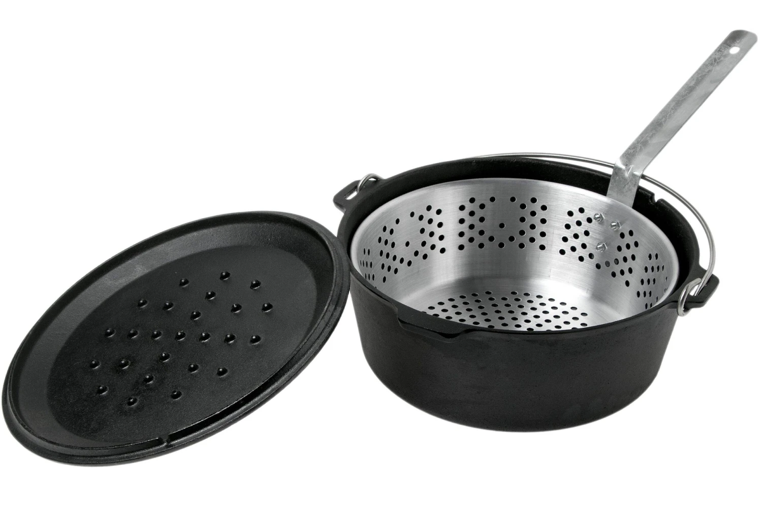 Grâce à cette friteuse Camp Chef, préparez vos snacks préférés : frites, beignets, et autres produits de friture. Ou utilisez-la simplement comme marmite pour cuisiner (en extérieur). Sur le feu de camp, sur une gazinière ou dans le four. La marmite n’a pas de pieds et se pose de façon stable sur une grille de four ou sur une gazinière. Les propriétés uniques de la fonte garantissent une excellente répartition de la chaleur. Elle est livrée avec un panier de friture avec poignée et un couvercle. La fonte a été traitée selon le traitement ‘true Seasoned Finish’. La finition est donc lisse et les ustensiles de cuisson sont immédiatement prêts à l’emploi.