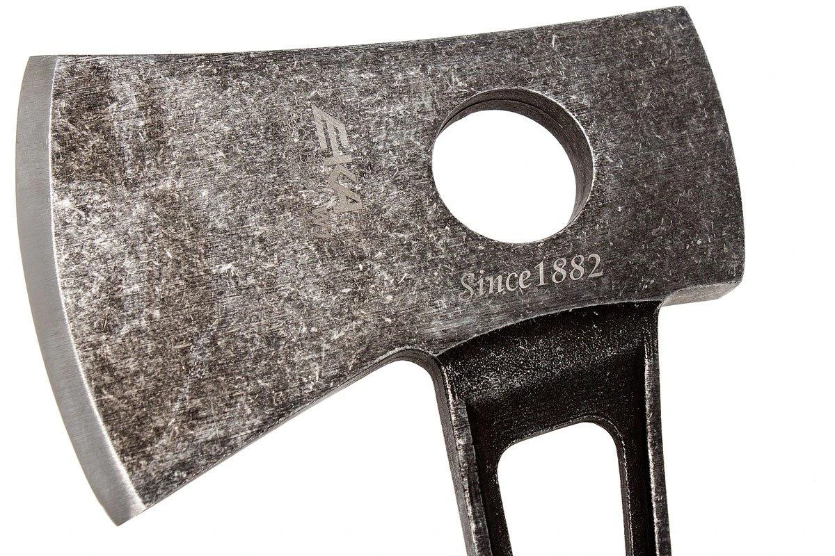 L’EKA HatchBlade est une petite hache légère et polyvalente. Le compagnon idéal lors de campements, situations de survie, ou tout simplement dans votre jardin. La tête de hache est en acier Sandvik 12C27. Un acier résistant à la corrosion qui conserve bien son tranchant. Avec une dureté de 47-50 HRC, elle ne craint pas les ébréchures, le tranchant ne risque pas de se briser. Elle est dotée d’une finition blackwashed.