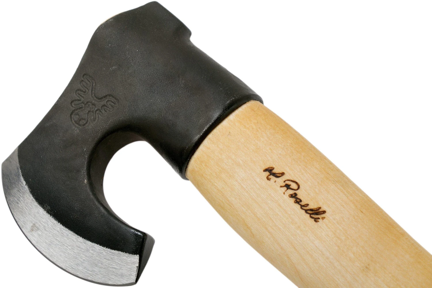 La hache à main Roselli très ajustée, est une hache très efficace pour fendre et préparer du petit bois. La longue tête de hache et la courbe de la lame permettent d’éviter que du bois ne s’y coince. La forme de la tête fait qu’on travaille la main près de la lame, ce qui rend les tâches plus fines, comme la fabrication de bâtons de feu, méga simples. Avec sa tige droite et sa tête plus épaisse, cette hache tient confortablement en main. Les haches Roselli sont encore entièrement fabriquées à la main à Harmoinen en Finlande. Le mariage d’un savoir-faire ancien avec un charme moderne.